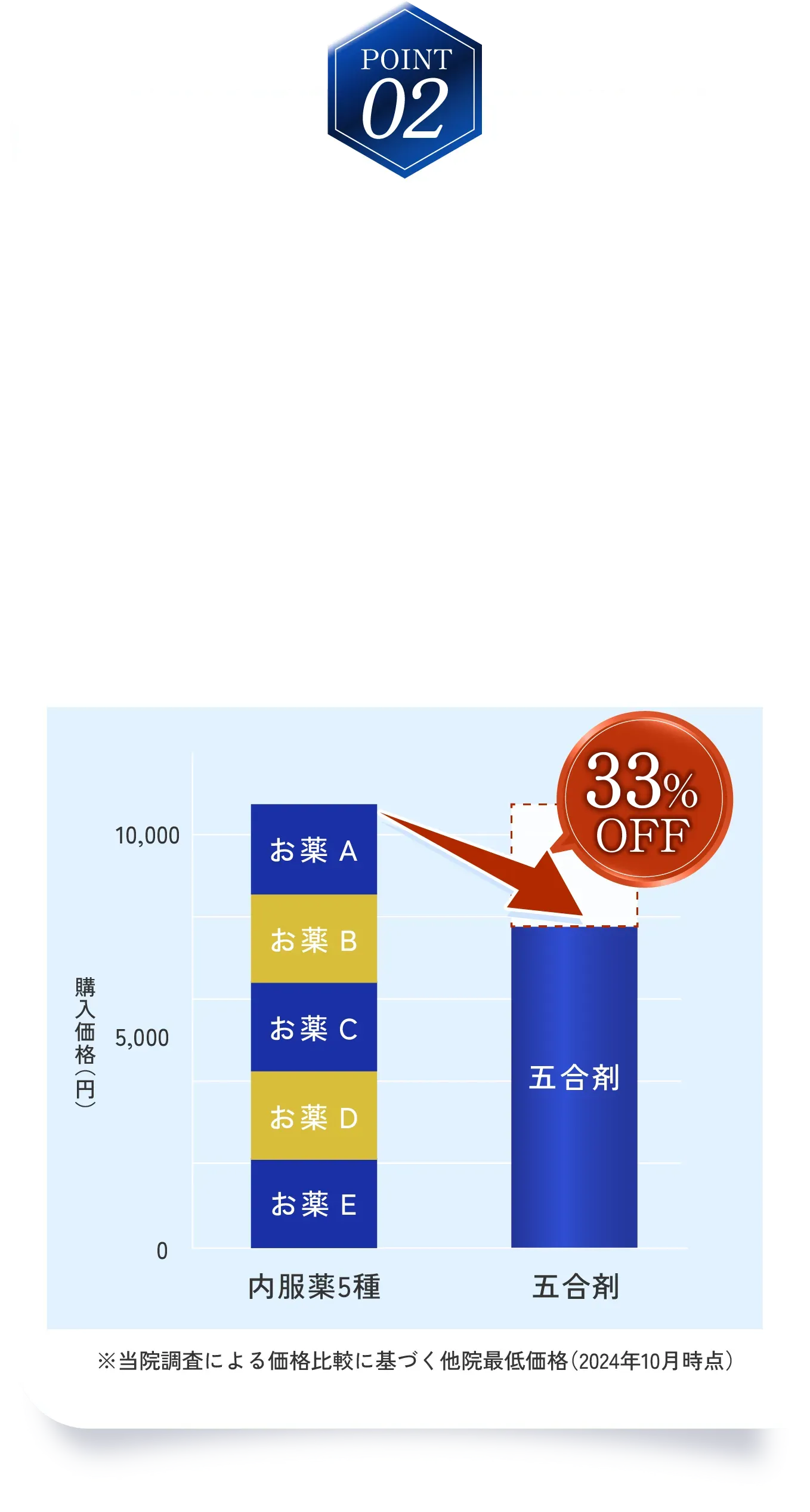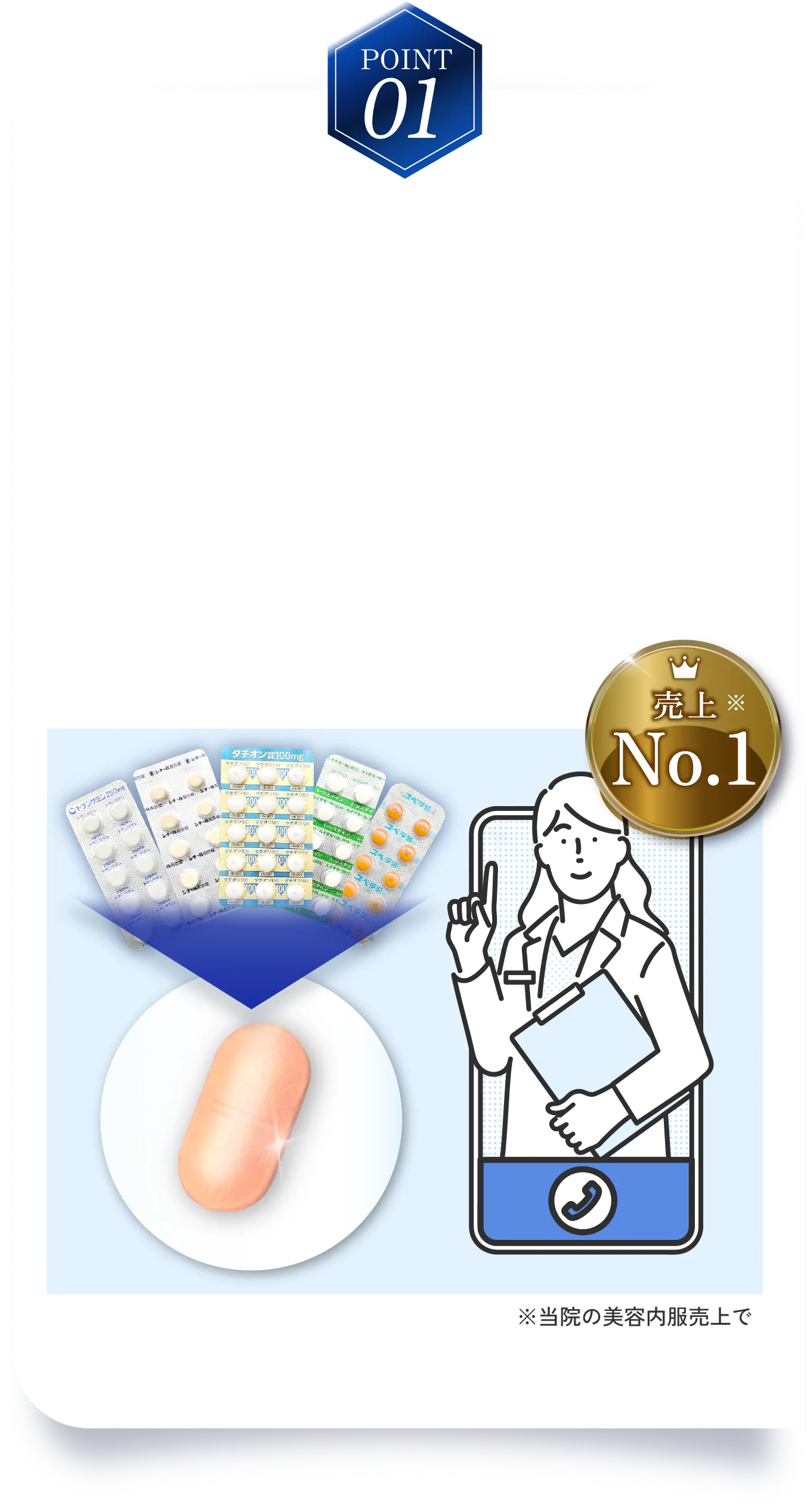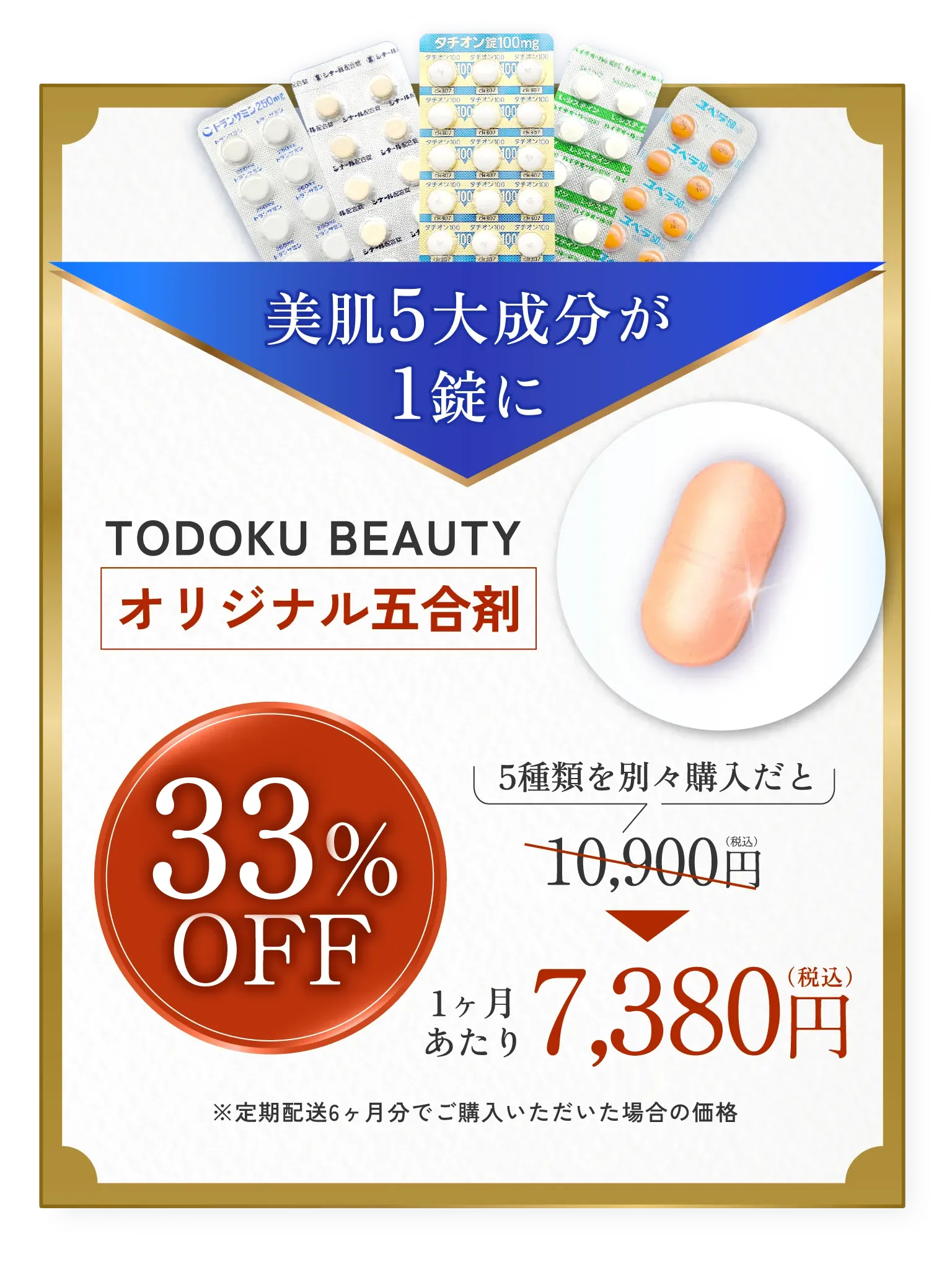 5種類の人気内服薬を1錠にすることで大幅なコストダウンに成功。TODOKU CLINICは患者様が経済的な負担が理由で美しさの探求を諦めないような価格設定を実現しています。