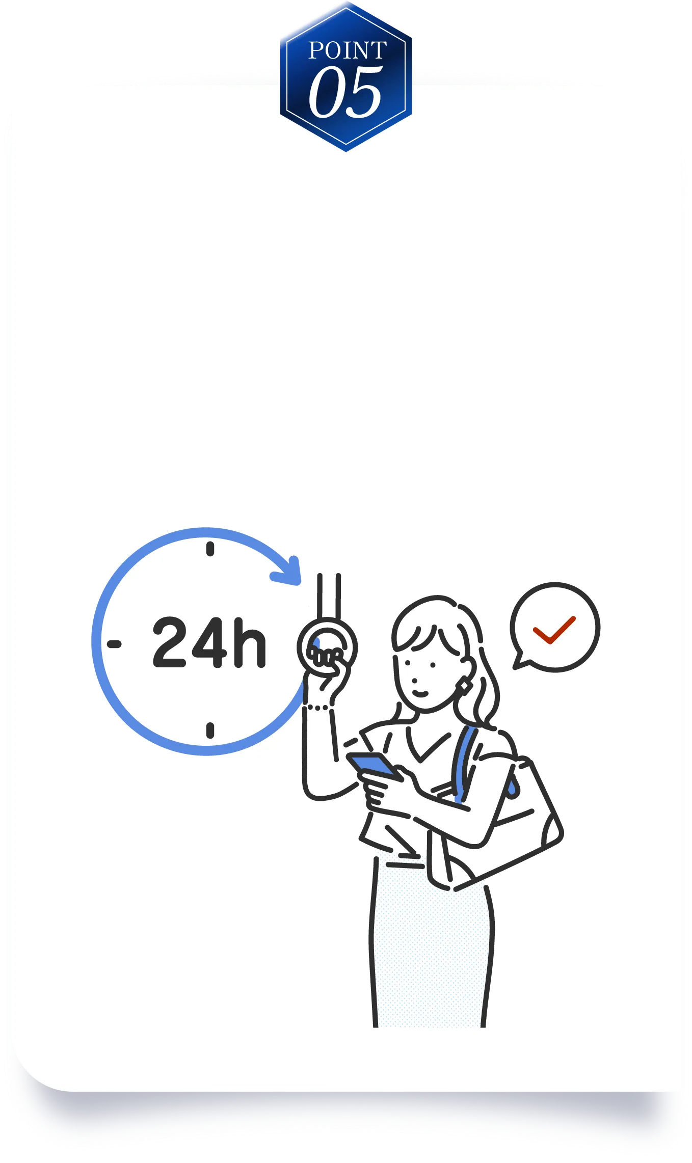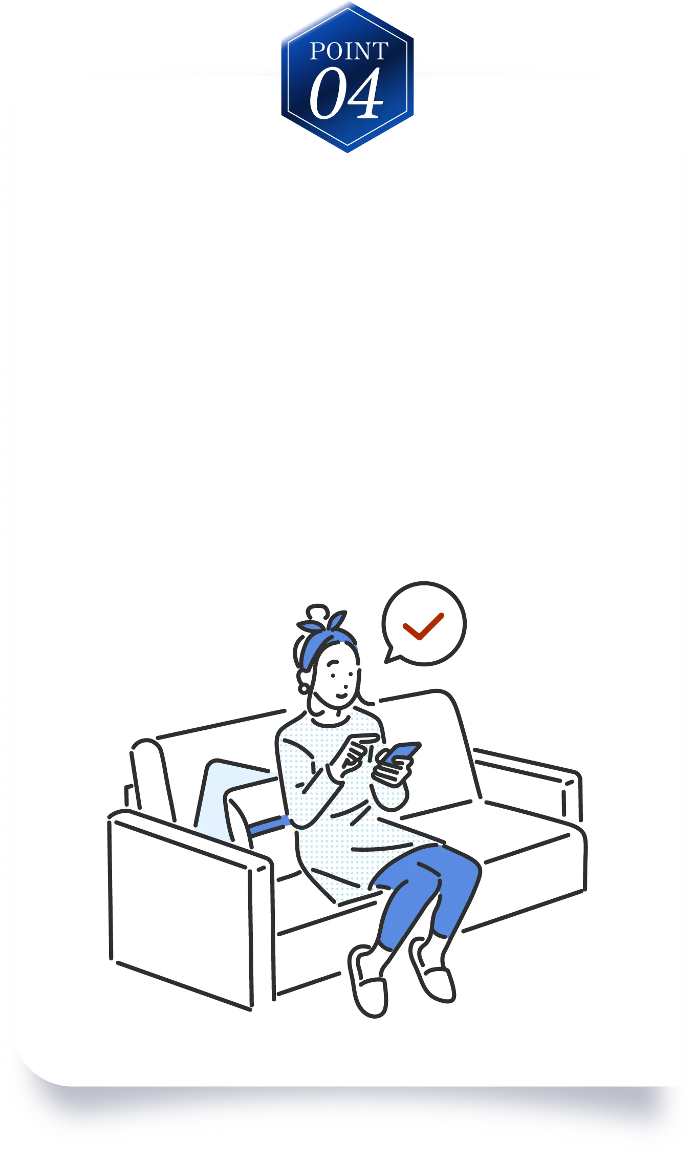 皮膚科に行く時間がない方でもスマホひとつで診療が完結します。完全予約制なので待ち時間もなく、夜まで診療時間枠はあるので、忙しい人でもスキマ時間で受診いただけます。