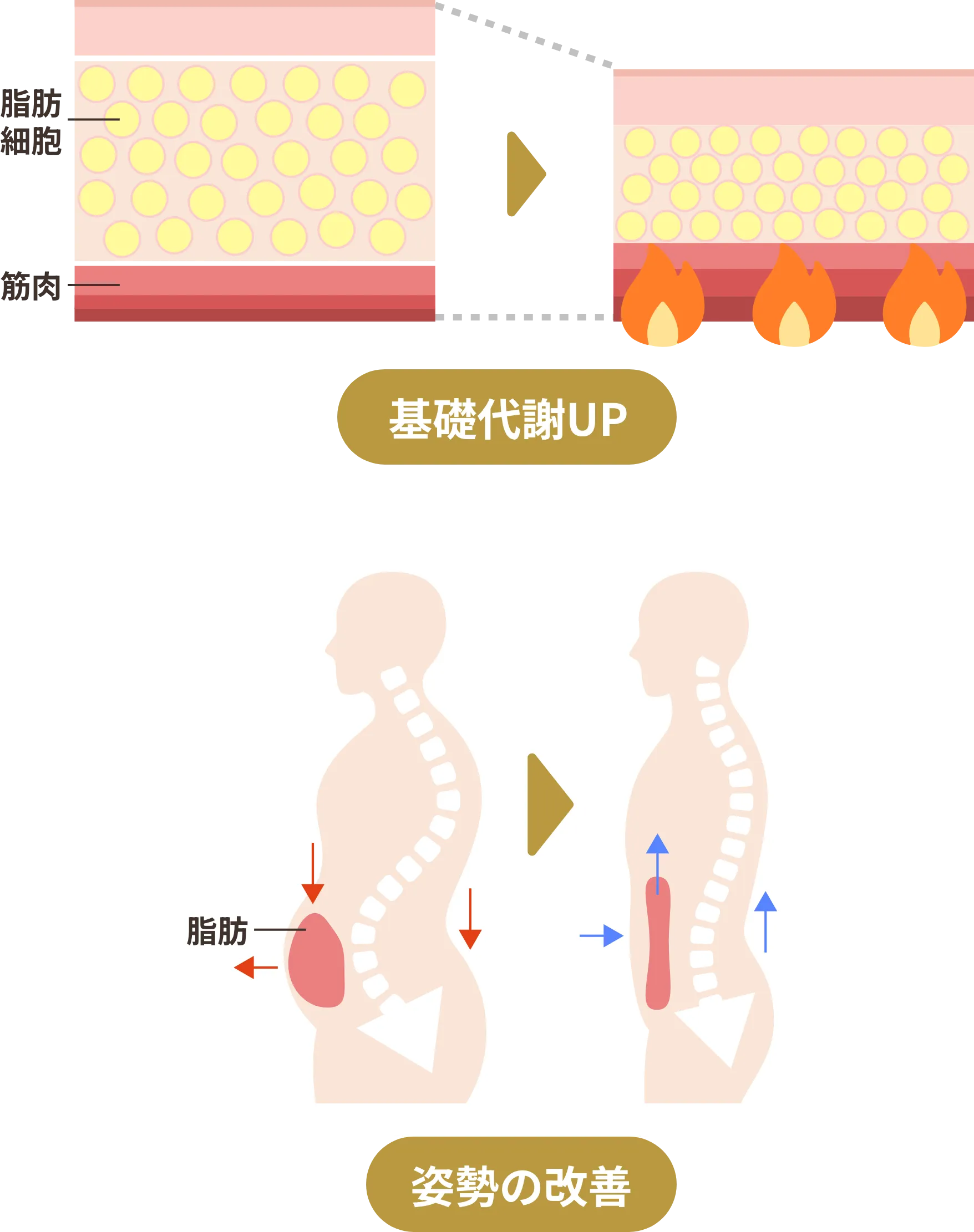 筋肉量が増えることで基礎代謝(エネルギーの消費量)が増加し、痩せやすい体質へと変化します。