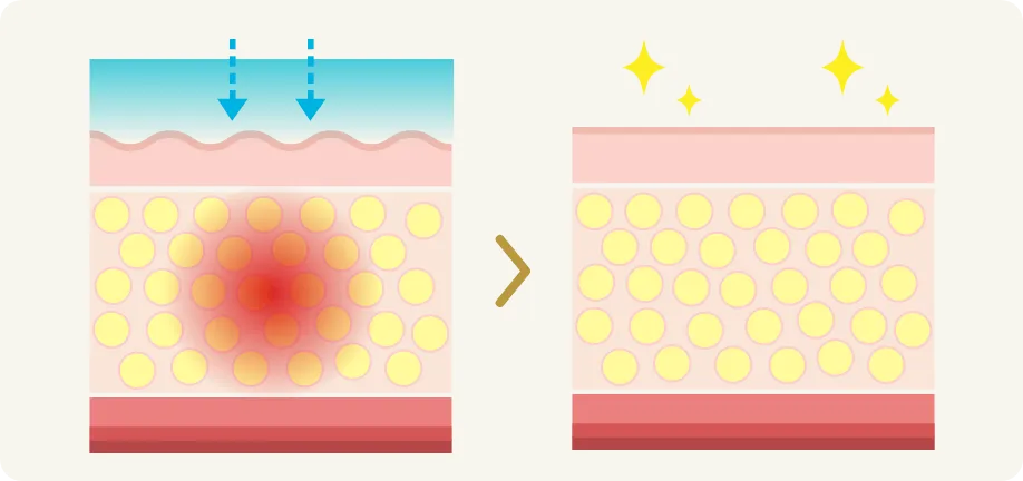 皮下脂肪には熱によるアポトーシス(自然死)を促し、コラーゲン線維の収縮によって肌を内側から引き締めます。